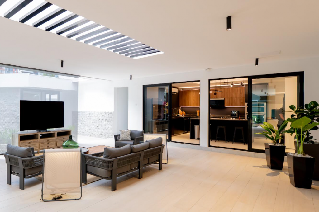 Cada ambiente se transforma de acuerdo con las preferencias del usuario. En la sala principal, por ejemplo, un simple comando activa el Modo Película, bajando las cortinas, ajustando la temperatura y creando una atmósfera cinematográfica. Para los amantes del gaming, el Modo Juego sincroniza luces y sonido con la acción en pantalla, mientras el aire acondicionado WindFree mantiene el confort ideal.