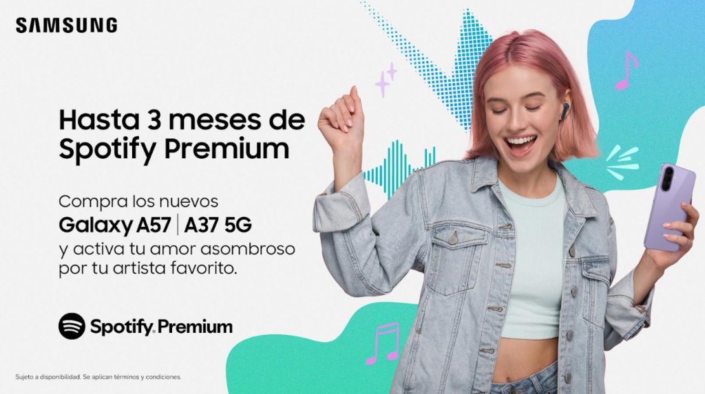 Samsung anuncia una alianza con Spotify, la plataforma de streaming musical más grande del mundo, en una colaboración en América Latina que ofrece hasta tres meses de Spotify Premium para los consumidores que adquieran los nuevos Galaxy A57, Galaxy A37, Galaxy A1 y Galaxy A07, colocando la música en el centro de la experiencia de la nueva línea Galaxy A. Spotify Premium garantiza acceso a música sin anuncios, descargas para escuchar offline y más libertad para elegir qué escuchar en cualquier momento.