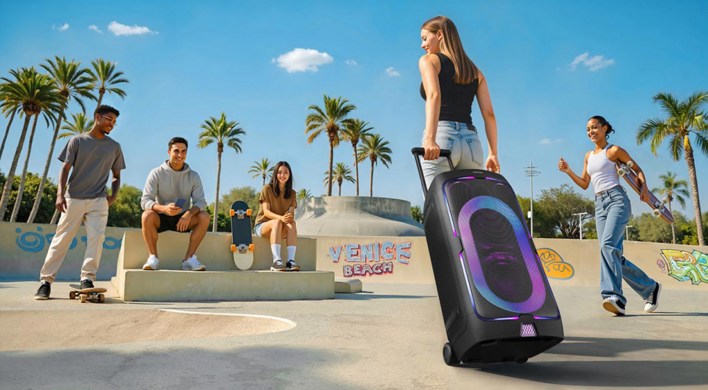 - Sound Tower ST50F: Salida de 240 W, hasta 18 horas de duración de batería, woofers duales de 6,5”, tweeters de doble cúpula de 25 mm, asa telescópica + ruedas, resistencia al agua IPX4.